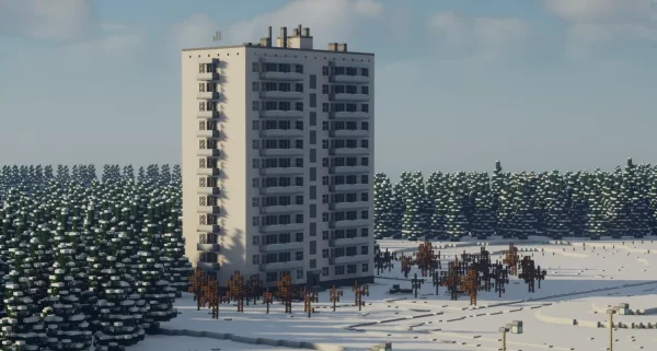 Каждый уголок карты тщательно проработан: улицы вымощены булыжником, фасады домов передают характер советской архитектуры, а дополнительные шейдеры добавляют мягкие блики, глубину теней и насыщенные цвета, усиливая ощущение реализма и визуальной гармонии.