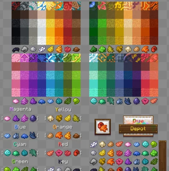 Dye Depot добавляет в мир Minecraft целых шестнадцать свежих оттенков красителей, что значительно расширяет возможности оформления и придает любителям декора новые горизонты творчества. Благодаря этому моду Палитра красок становится по-настоящему безграничной: вы можете создавать великолепные цветовые сочетания, придавая привычным предметам и блокам совершенно новый вид.