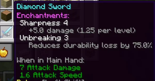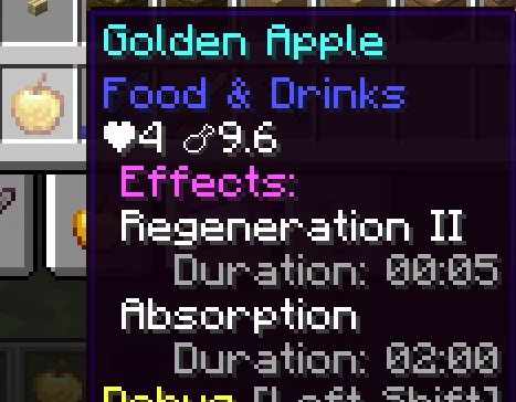 Raynna's ToolTips расширяет стандартные подсказки в инвентаре, показывая больше полезной информации прямо на карточке предмета: у еды отображаются количество восстанавливаемого здоровья и уровень насыщения, на зачарованных вещах - описание эффектов чар, а на зельях, золотых яблоках и загадочном рагу - соответствующие эффекты.